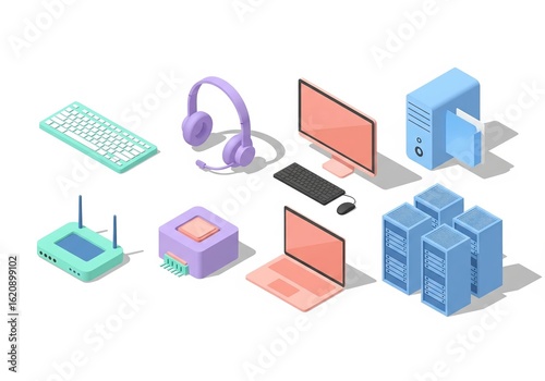 Premium isometric vector collection of gaming gear and computer equipment including keyboard, headphones, PC case and laptop