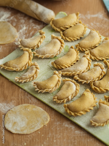 Preparing dumplings: A vertical close-up of Ukrainian varenyky on a cutting board, arranged in three rows. Dough circles are visible, with flour scattered across the table.