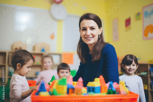 Preschool caucasian teacher playing with kids at kindergarten. Generative AI.