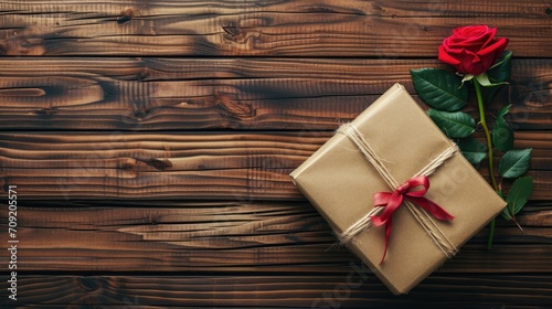 Present and red rose on wooden background, valentine's day