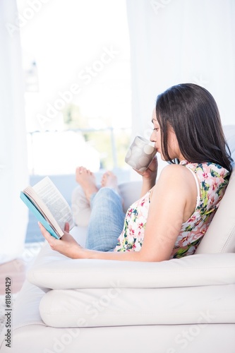 Pretty brunette reading a book on couch