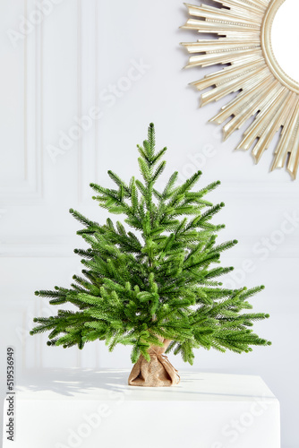 Pretty bushy danish Christmas tree without decorations in a large pot wrapped in sackcloth with space for your message on white background