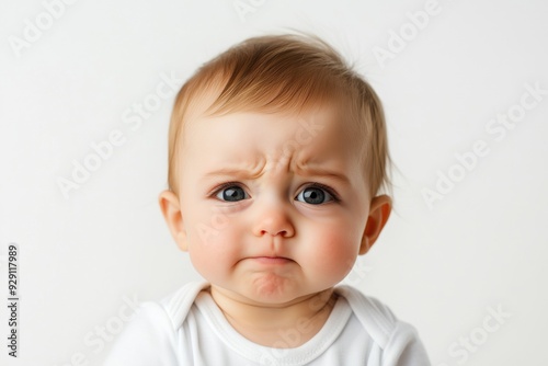 Pretty frowned little child on neutral background with copyspace