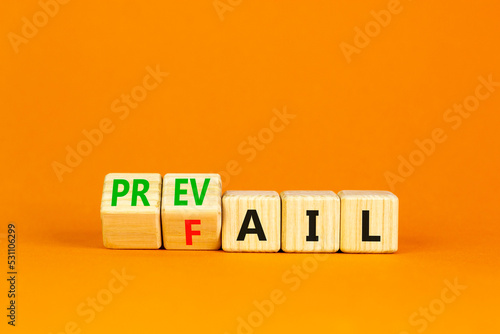 Prevail or fail symbol. Concept words Prevail or Fail on wooden cubes. Beautiful orange table orange background. Business prevail or fail concept. Copy space.