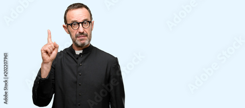 Priest religion man happy and surprised cheering expressing wow gesture pointing up isolated over blue background