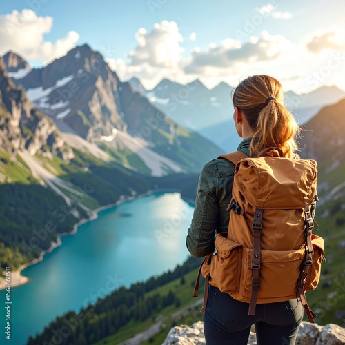 Primer plano de un mochilero asomado en un risco con maravillosas vistas a un lago y valle entre montañas. Aventura, excursionismo, naturaleza
