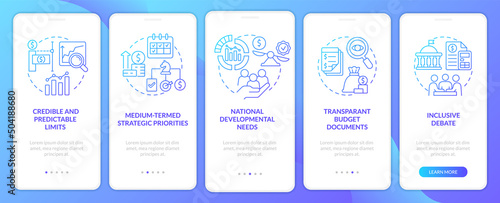 Principles of budget planning blue gradient onboarding mobile app screen. Walkthrough 5 steps graphic instructions pages with linear concepts. UI, UX, GUI template. Myriad Pro-Bold, Regular fonts used