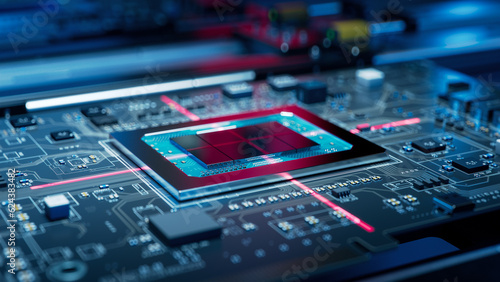 Printed Circuit Board with Advanced Processing Unit. Electronic Devices Production Industry. Fully Automated PCB Assembly Line. Conveyor on Electronics Factory.