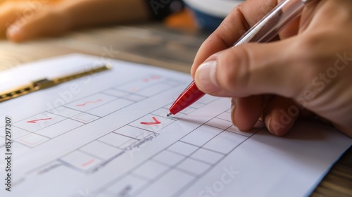 Printed questionnaire quality check document being checked off with a red pen, close-up of hand. Questionnaire quality check document