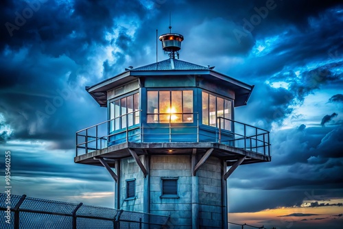 Prison watchtower with iconic eagle symbol, imposing power and surveillance in cool, muted blues and grays at dusk.