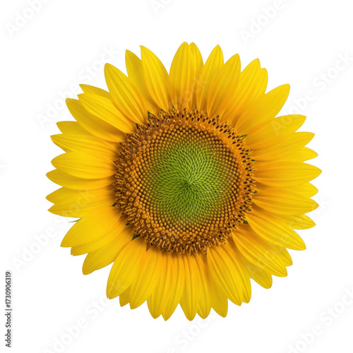 Pristine golden yellow sunflower, deep green central disc with intricate patterns, precisely angled at 45 degrees, isolated on a seamless transparent studio background with diffused light, commercial