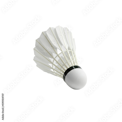 Pristine plastic shuttlecock with translucent white synthetic skirt and cork base, upright on a seamless plain white background with shadowless studio lighting, commercial product display concept