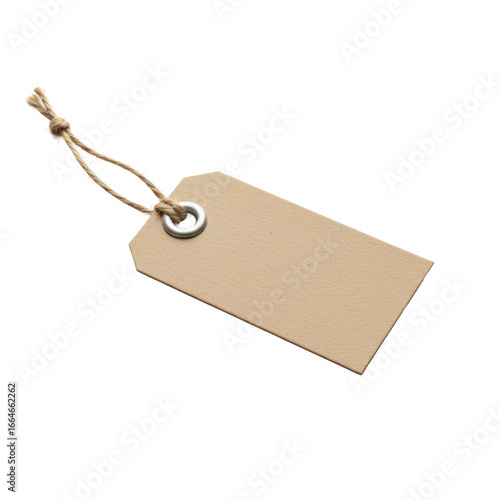 Pristine rectangular blank light brown kraft paper label with visible texture, beveled edge, white eyelet, and natural jute twine, isolated on white copy space, concept of branding potential