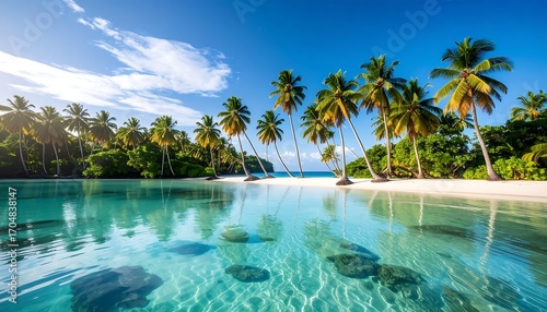 Pristine tropical beach scene with crystal clear turquoise water, white sand, and swaying palm trees under a vibrant blue sky