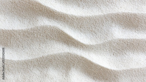 Pristine white sand forming gentle undulating patterns, revealing delicate granular texture characteristic of serene coastal landscapes and summer backdrops