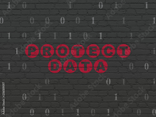 Privacy concept: Painted red text Protect Data on Black Brick wall background with Binary Code