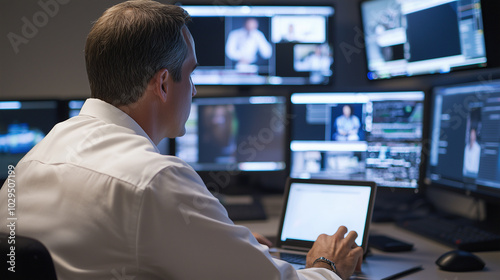 Private investigator reviewing surveillance footage on a laptop, with multiple screens showing different angles in a high-tech office photo