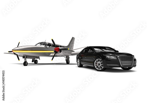 Private jet with a Luxury Car / 3D render image representing an private jet and a luxury car