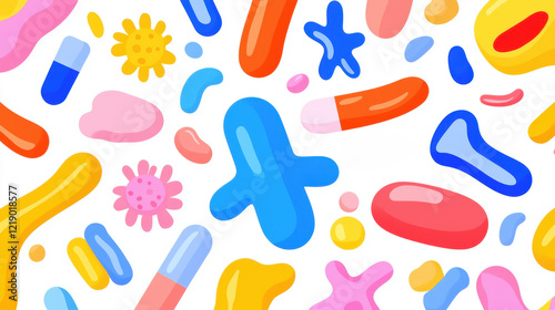 Probiotic illustration, Colorful abstract shapes resembling microbes and cells scattered on a white background, creating a playful and vibrant design.