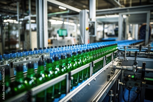 Process of beverage manufacturing on a conveyor belt at a factory.
