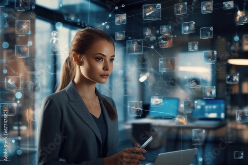 processing data over a woman using a laptop. AI-generated global computing, connectivity, communication,