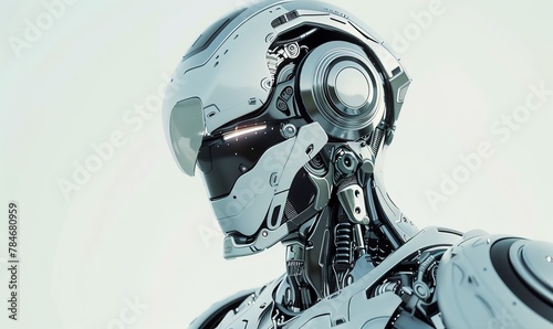 Produce a digital rendering of a sleek, futuristic robot in a clean, photorealistic style Showcase intricate details on its metallic body, emphasizing advanced technology