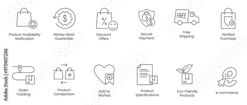 Product Availability Notification, Money Back Guarantee, Discount Offers, Secure Payment, Free Shipping, Verified Purchase, Order Tracking, Product Comparison, Add to Wishlist vector icon set