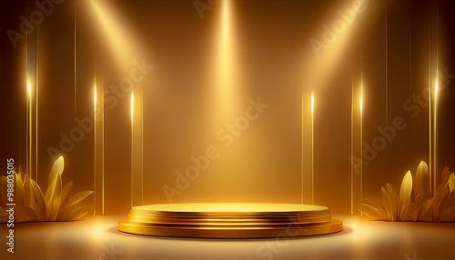 Product display presentation on luxury gold empty podium stand with shiny particles glamor to showcase stage advertising for cosmetics and beauty. Shining scene. Beautiful background. Generative AI