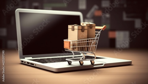Product package box in a shopping cart on the laptop