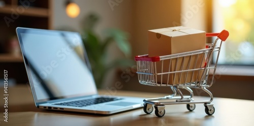 Product package boxes and shopping bag in cart with laptop computer, e-commerce, shopping cart