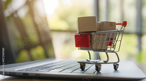 Product package boxes and shopping bag in cart with laptop computer which web store shop on screen for online shopping and delivery concept with miniature shopping cart standing in front of laptop