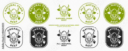 Product packaging concept. Labeling - natural farm beef. Cow head icon with leaf ears - Symbol of natural organic products. Vector set