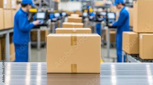 Product Packaging Line packaging machines, cardboard boxes, sealing process, assembly line workers, barcode scanners, efficiency, clear labels, modern packaging design