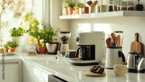 Product photography of a coffee machine and kettle placed on a white kitchen counter with various cooking
