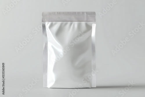 Product template mockup white creative design Realistic blank stand up pouch bag mockup plastic pouch blank with Ziplock Front view on gray background. Shiny silver package for template your design