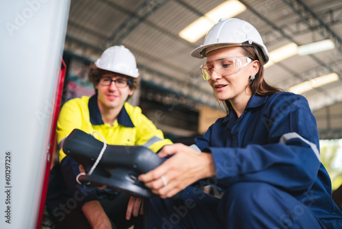 Production engineers in safety wear are assisting adjusting and maintaining CNC or factory machine, Male workers technician examining control the industrial tool, professional men at work in industry