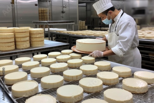 Production Process of Cream Cake at Factory, Chef Preparing Cheesecake, generative ai