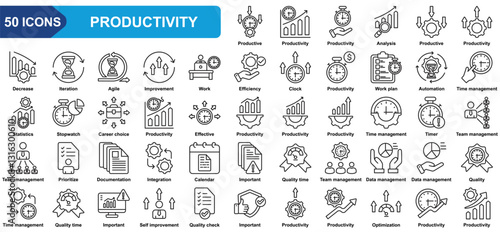 Productivity collection icon set. Work plan, Analysis, Productive, Time management, Statistics, Career choice, Prioritize, Quality time. Simple line vector.
