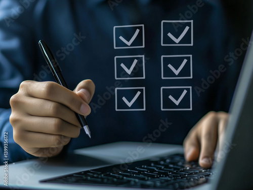 Productivity symbol featuring a person multitasking, holding a pen and working on a laptop, with completed checkboxes representing organizational efficiency, clipping path, close up, high quality.
