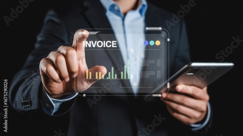 Professional analyzes company invoice data with augmented reality interface and mobile phone for financial insights