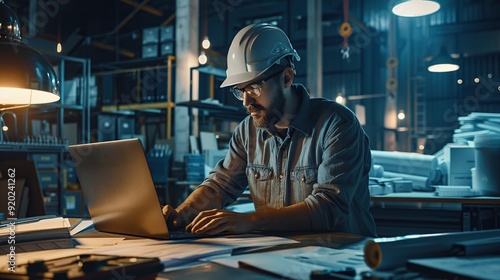 Professional architect designer engineer helmet man construction computer industrial working laptop architect professional job occupation. copy space for text.