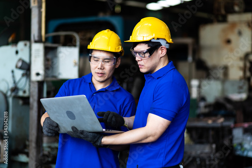 Professional Asian team engineering Man Worker at industrial factory wearing uniform and hardhats at Metal lathe industrial manufacturing factory. Engineer Operating lathe Machinery