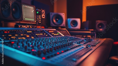 Professional audio mixing board in focus, with a studio broadcasting setup in the background, ready for sound production.