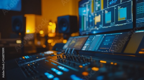 Professional audio mixing console with multiple screens displaying audio waveforms and levels in a dimly lit studio.