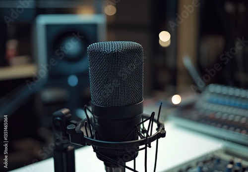 Professional Black Microphone on Stand, Studio Audio Equipment with Console, Speaker