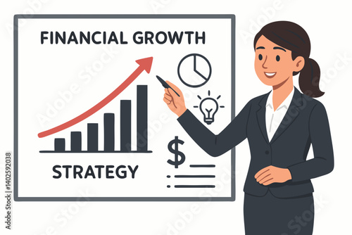 Professional Business Woman Presenting Financial Growth Strategy Chart with Upward Trend Graph, Dollar Symbol, Time Management Icons and Investment Planning Concepts for Corporate Success