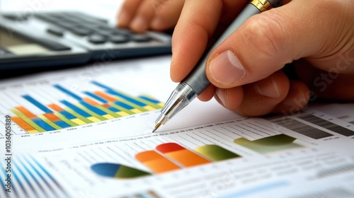 Professional businessman analyzing financial reports, spreadsheets, and graphs, highlighting financial planning and analysis, hand with pen shown