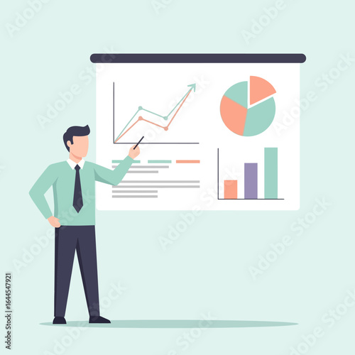 Professional businessman in a mint green shirt giving a presentation, pointing at financial charts and graphs on a whiteboard.