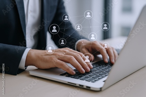 Professional Businessman Working on Laptop with Social Network Connection, Networking and Digitalization in the Office