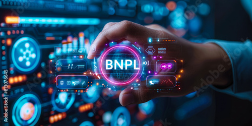 Professional businessperson utilizing modern BNPL Buy Now, Pay Later digital financial technology interface, presenting instant retail installment payment plan options on futuristic virtual dashboard